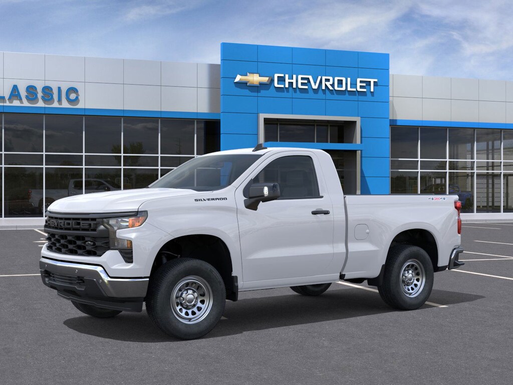 Dark Essentials Package (LPO) (Black Name Plates (LPO)), Standard Suspension Package, Trailering Package (Hitch Guidance), WT Convenience Package (Deep-Tinted Glass and Electric Rear-Window Defogger), WT Safety Package (Front Chrome Bumper, High Gloss Black Mirror Caps, Lane Change Alert w/Side Blind Zone Alert, Perimeter Lighting, Rear Chrome Bumper, Rear Cross Traffic Braking, Rear Pedestrian Alert, and Ultrasonic Front & Rear Park Assist), WT Value Package, 120-Volt Bed Mounted Power Outlet, 120-Volt Interior Power Outlet, All-Weather Floor Liner (LPO), Auto-Locking Rear Differential, Color-Keyed Carpeting Floor Covering, Front Rubberized Vinyl Floor Mats, Integrated Trailer Brake Controller, Multi-Flex Tailgate, 2 Speakers, 2-Speaker Audio System, 220 Amp Alternator, 3.42 Rear Axle Ratio, 3.5 Monochromatic Display Driver Info Center, 4-Way Manual Driver Seat Adjuster, 4-Wheel Disc Brakes, 40/20/40 Front Split Bench Seat, ABS brakes, Air Conditioning, Apple CarPlay/Android Auto, Auto High-beam Headlights, Automatic Emergency Braking, Black (Semi-Gloss) Front Bumper, Black (Semi-Gloss) Rear Bumper, Bluetooth® For Phone, Brake assist, Compass, Delay-off headlights, Driver door bin, Dual front impact airbags, Dual front side impact airbags, Electronic Cruise Control, Electronic Stability Control, Emergency communication system: OnStar, EZ Lift Power Lock & Release Tailgate, Following Distance Indicator, Forward Collision Alert, Front anti-roll bar, Front Center Armrest w/Storage, Front Frame-Mounted Black Recovery Hooks, Front Pedestrian Braking, Front reading lights, Front wheel independent suspension, Fully automatic headlights, HD Rear Vision Camera, Heated door mirrors, Heated Power-Adjustable Outside Mirrors, Illuminated entry, Inside Rear-View Mirror w/Tilt, IntelliBeam Automatic High Beam On/Off, Lane Keep Assist w/Lane Departure Warning, Locking Tailgate, Low tire pressure warning, Manual Tailgate Function w/No EZ Lift, Manual Tilt Wheel Steering Column, Occupant sensing airbag, OnStar Services Capable, Outside temperature display, Overhead airbag, Overhead console, Panic alarm, Passenger door bin, Passenger vanity mirror, Power door mirrors, Power Front Windows w/Driver Express Up/Down, Power steering, Power windows, Premium audio system: Chevrolet Infotainment 3, Radio data system, Radio: Chevrolet Infotainment 3 System, Rear reading lights, Rear step bumper, Remote Keyless Entry, Remote keyless entry, Rubberized-Vinyl Floor Covering, SiriusXM Delete, Solar Absorbing Tinted Glass, Speed control, Speed-sensing steering, Standard Tailgate, Tachometer, Teen Driver, Tilt steering wheel, Tire Pressure Monitoring System, Traction control, Trip computer, Variably intermittent wipers, Vinyl Seat Trim, Voltmeter, Wheels: 17 x 8 Ultra Silver Painted Steel, and Wi-Fi Hot Spot Capable. Price includes: $1000 - Bonus Cash. Exp. 11/03/2025 $1750 - Customer Cash. Exp. 11/03/2025