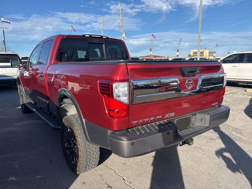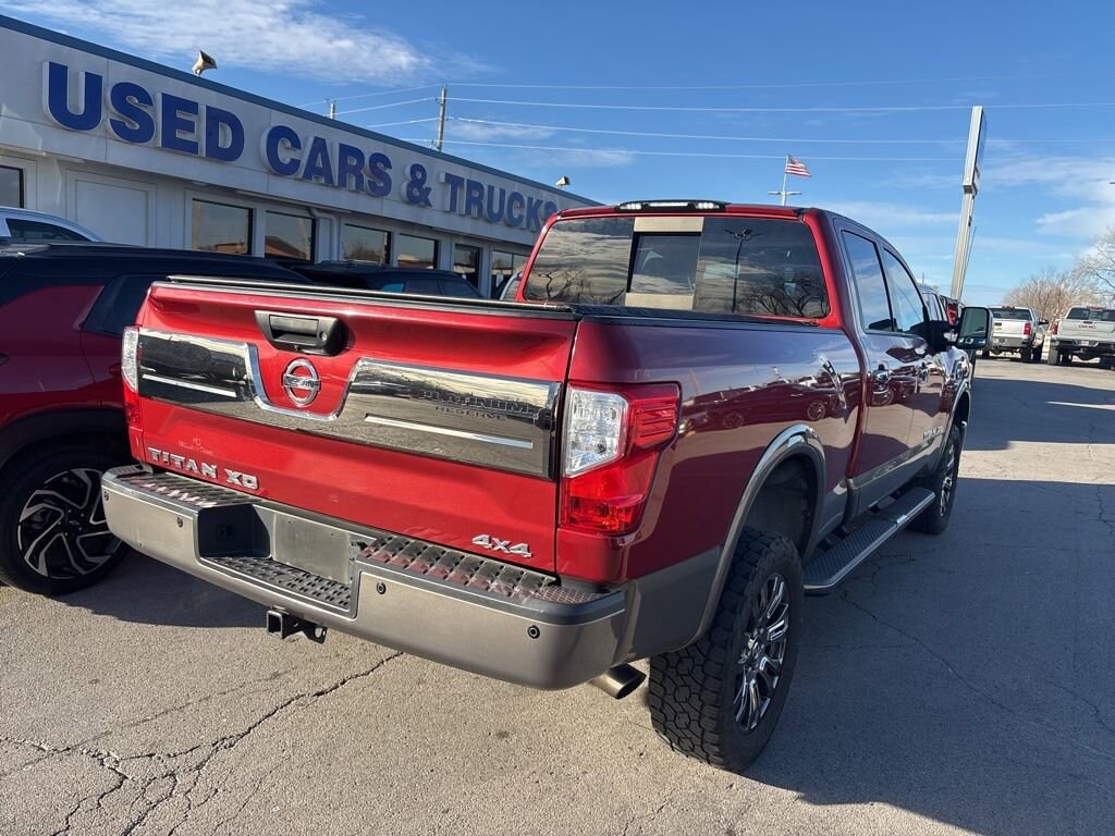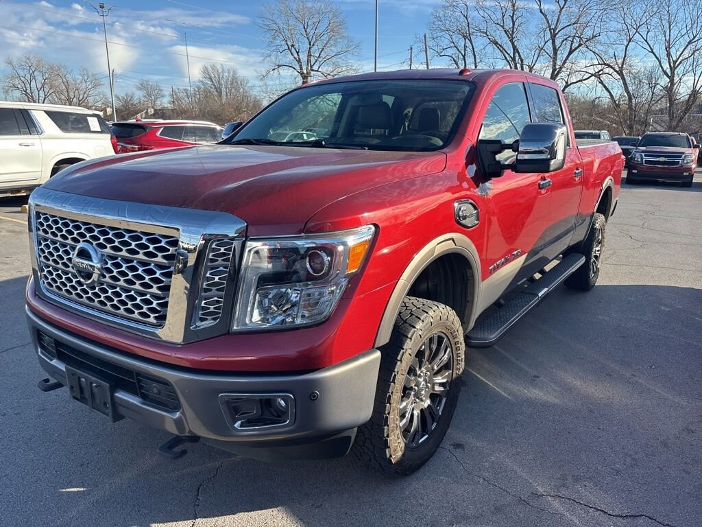 Recent Arrival! **4WD**, **AWD**, **BLUETOOTH**, **CLEAN CARFAX**, **KEYLESS ENTRY**, **LOCAL TRADE**, **NON-SMOKER**, **REAR BACKUP CAMERA**. 12 Speakers, 3.916 Axle Ratio, 4-Wheel Disc Brakes, ABS brakes, Activation Disclaimer, Air Conditioning, Alloy wheels, AM/FM radio: SiriusXM, Auto tilt-away steering wheel, Auto-dimming door mirrors, Auto-dimming Rear-View mirror, Automatic temperature control, Block heater, Brake assist, CD player, Chrome wheels, Compass, Delay-off headlights, Door Sill Kickplates (Set of 4), Driver door bin, Driver vanity mirror, Dual front impact airbags, Dual front side impact airbags, Electronic Stability Control, Emergency communication system, Front anti-roll bar, Front Bucket Seats, Front Center Armrest, Front dual zone A/C, Front fog lights, Front reading lights, Front wheel independent suspension, Garage door transmitter: HomeLink, Gooseneck Ball, Anchors & Bag, Heated & Cooled Captain's Chairs, Heated door mirrors, Heated front seats, Heated rear seats, Heated steering wheel, Illuminated entry, Leather Shift Knob, Leather steering wheel, Low tire pressure warning, Memory seat, Navigation System, Occupant sensing airbag, Outside temperature display, Overhead airbag, Overhead console, Panic alarm, Passenger door bin, Passenger vanity mirror, Platinum Reserve Titan Floor Mats, Power door mirrors, Power driver seat, Power passenger seat, Power steering, Power windows, Premium Leather Seat Trim, Radio data system, Radio: NissanConnect w/SiriusXM/Navi & Mobile Apps, Rain sensing wipers, Rear anti-roll bar, Rear seat center armrest, Rear Seat Storage Compartment, Rear step bumper, Rear window defroster, Remote keyless entry, Rockford Fosgate Premium 12 Speaker Audio System, Running Boards, Security system, Speed control, Speed-sensing steering, Speed-Sensitive Wipers, Split folding rear seat, Steering wheel memory, Steering wheel mounted audio controls, Tachometer, Telescoping steering wheel, Tilt steering wheel, Traction control, Turn signal indicator mirrors, Variably intermittent wipers, Ventilated front seats, Voltmeter, and Wheels: 20 x 7.5 Dark Chrome-Like PVD. Odometer is 27839 miles below market average!2017 Nissan Titan XD Platinum Reserve 4WD Aisin 6-Speed Automatic 5.0L V8 Cayenne Red