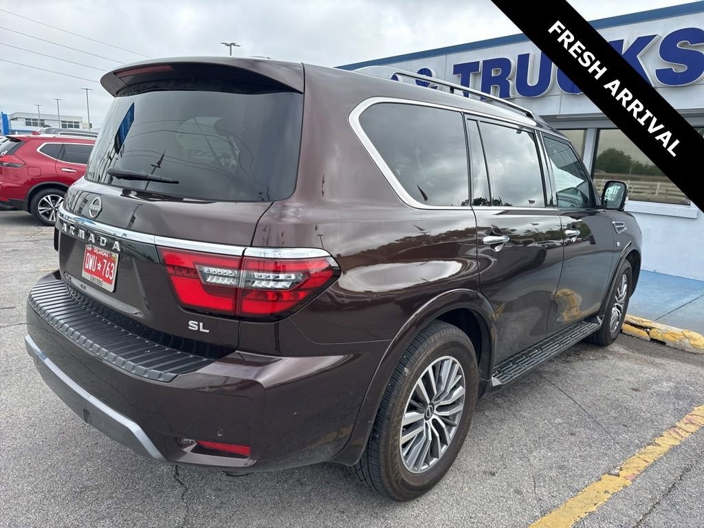 Recent Arrival! **4WD**, **ANDROID CARPLAY**, **APPLE CARPLAY**, **AUTO HEADLIGHTS**, **BLIND SPOT WARNING SYS**, **BLUETOOTH**, **CLEAN CARFAX**, **HEATED SEATS**, **KEYLESS ENTRY**, **LANE DEPARTURE WARNING**, **LEATHER**, **MOONROOF**, **NAVIGATION**, **REAR BACKUP CAMERA**, **REMOTE START**, **RUNNING BOARDS**, **USB PORT**. Captain's Chairs Package (2nd Row Captain's Chairs and 2nd Row Center Console w/Padded Armrest), 13 Speakers, 2.94 Axle Ratio, 3rd Row Carpeted Floor Mats - Captain Seat, 3rd row seats: split-bench, 4-Wheel Disc Brakes, ABS brakes, Air Conditioning, Alloy wheels, AM/FM radio: SiriusXM, Anti-whiplash front head restraints, Auto High-beam Headlights, Auto tilt-away steering wheel, Auto-dimming door mirrors, Auto-dimming Rear-View mirror, Auto-leveling suspension, Automatic temperature control, Brake assist, Bumpers: body-color, Delay-off headlights, Driver door bin, Driver vanity mirror, Dual front impact airbags, Dual front side impact airbags, Electronic Stability Control, Emergency communication system: NissanConnect Services, Exterior Parking Camera Rear, Four wheel independent suspension, Front anti-roll bar, Front Bucket Seats, Front Center Armrest, Front dual zone A/C, Front fog lights, Front reading lights, Fully automatic headlights, Garage door transmitter: HomeLink, Heated door mirrors, Heated Front Bucket Seats, Heated front seats, Illuminated entry, Knee airbag, Leather Shift Knob, Leather-Appointed Seat Trim, Low tire pressure warning, Memory seat, Navigation System, NissanConnect featuring Apple CarPlay and Android Auto, Occupant sensing airbag, Outside temperature display, Overhead airbag, Overhead console, Panic alarm, Passenger door bin, Passenger vanity mirror, Power door mirrors, Power driver seat, Power Liftgate, Power moonroof, Power passenger seat, Power steering, Power windows, Radio: NissanConnect w/SiriusXM, Rear air conditioning, Rear anti-roll bar, Rear reading lights, Rear seat center armrest, Rear window defroster, Rear window wiper, Reclining 3rd row seat, Remote keyless entry, Security system, Speed control, Speed-sensing steering, Speed-Sensitive Wipers, Split folding rear seat, Spoiler, Steering wheel memory, Steering wheel mounted audio controls, Tachometer, Telescoping steering wheel, Tilt steering wheel, Traction control, Trip computer, Turn signal indicator mirrors, Variably intermittent wipers, Voltmeter, and Wheels: 20 x 8J Painted Alloy. Odometer is 4923 miles below market average!2022 Nissan Armada SL 4WD 7-Speed Automatic 5.6L V8 DOHC 32V LEV3-ULEV125 400hp Mocha Almond Pearl