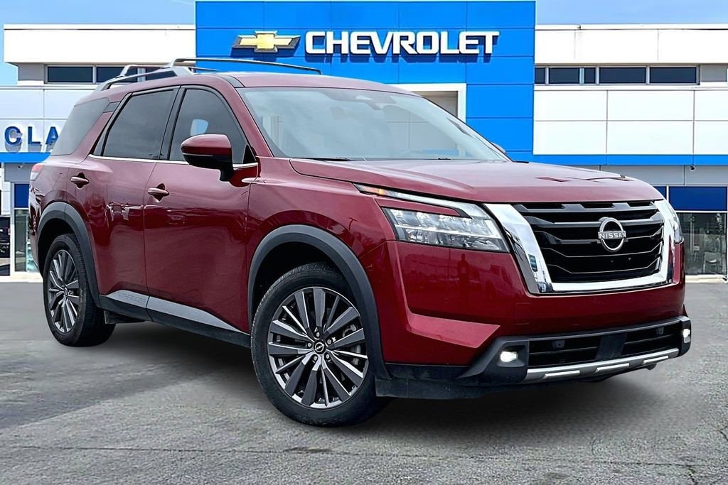 Recent Arrival! **ANDROID CARPLAY**, **APPLE CARPLAY**, **BLUETOOTH**, **CLEAN CARFAX 1-OWNER**, **CLEAN CARFAX**, **DAYTIME RUNNING LIGHTS**, **HEATED SEATS**, **KEYLESS ENTRY**, **LEATHER**, **MOONROOF**, **REAR BACKUP CAMERA**, **USB PORT**. SL Premium Package (20 Painted Alloy Wheels, 2nd-Row Captain Chairs, 2nd-Row Removable Center Console, Bose Premium Audio System, Heated Rear Seats, Panoramic Moonroof, and Tow Hitch Receiver & Harness), Tow Delete Package (Delete Tow Hitch Receiver & Harness), 18 Machined Alloy Wheels, 3rd row seats: bench, 4-Wheel Disc Brakes, 6 Speakers, ABS brakes, Air Conditioning, Alloy wheels, AM/FM radio: SiriusXM, Auto High-beam Headlights, Auto-dimming Rear-View mirror, Automatic temperature control, Axle Ratio: 4.334, Brake assist, Bumpers: body-color, Captain's Chairs Carpeted Floor Mats (Set of 4), Cross Bars, Delay-off headlights, Driver door bin, Driver vanity mirror, Dual front impact airbags, Dual front side impact airbags, Electronic Stability Control, Emergency communication system: NissanConnect Services, Exterior Parking Camera Rear, Four wheel independent suspension, Front anti-roll bar, Front Bucket Seats, Front Center Armrest, Front dual zone A/C, Front reading lights, Fully automatic headlights, Garage door transmitter: HomeLink, Heated door mirrors, Heated Front Bucket Seats, Heated front seats, Heated steering wheel, Illuminated entry, Knee airbag, Leather Seating Surfaces, Leather steering wheel, LED Fog Lamps, Low tire pressure warning, Navigation system: NissanConnect Navigation, NissanConnect w/Navigation & Services, Occupant sensing airbag, Outside temperature display, Overhead airbag, Overhead console, Panic alarm, Passenger door bin, Passenger vanity mirror, Power door mirrors, Power driver seat, Power Liftgate, Power passenger seat, Power steering, Power windows, Radio data system, Radio: AM/FM Audio System, Rear air conditioning, Rear anti-roll bar, Rear reading lights, Rear seat center armrest, Rear side impact airbag, Rear window defroster, Rear window wiper, Reclining 3rd row seat, Remote keyless entry, Security system, Speed control, Speed-sensing steering, Split folding rear seat, Spoiler, Steering wheel mounted audio controls, Tachometer, Telescoping steering wheel, Tilt steering wheel, Traction control, Trip computer, Turn signal indicator mirrors, and Variably intermittent wipers.2023 Nissan Pathfinder SL FWD 9-Speed Automatic V6 Scarlet Ember Tintcoat20/27 City/Highway MPG